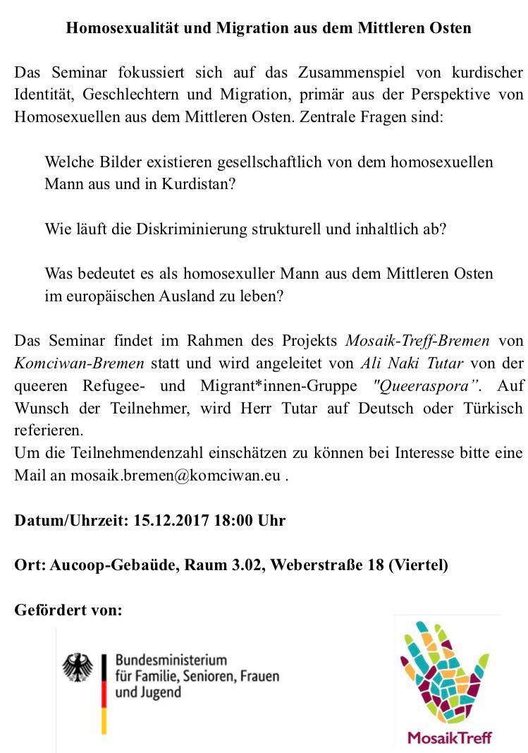 Zuletzt am 15.12.2017 hatten wir ein Seminar zum Thema „Homosexualität und Migration aus dem Mittleren Osten“. Wir beschäftigten uns dabei mit dem Zusammenspiel von kurdischer Identität, Geschlechtern und Migration, primär aus der Perspektive von Homosexuellen aus dem Mittleren Osten. Zentrale Fragen waren: Welche Bilder existieren gesellschaftlich von dem homosexuellen Mann aus und in Kurdistan? Wie läuft die Diskriminierung strukturell und inhaltlich ab? Was bedeutet es als homosexueller Mann aus dem Mittleren Osten im europäischen Ausland zu leben? Das Seminar wurde angeleitet von Ali Naki Tutar von der queeren Refugee- und Migrant*innen-Gruppe „Queeraspora“. Wir haben unter seiner Leitung viel gelernt und auch durchaus kontrovers diskutiert.